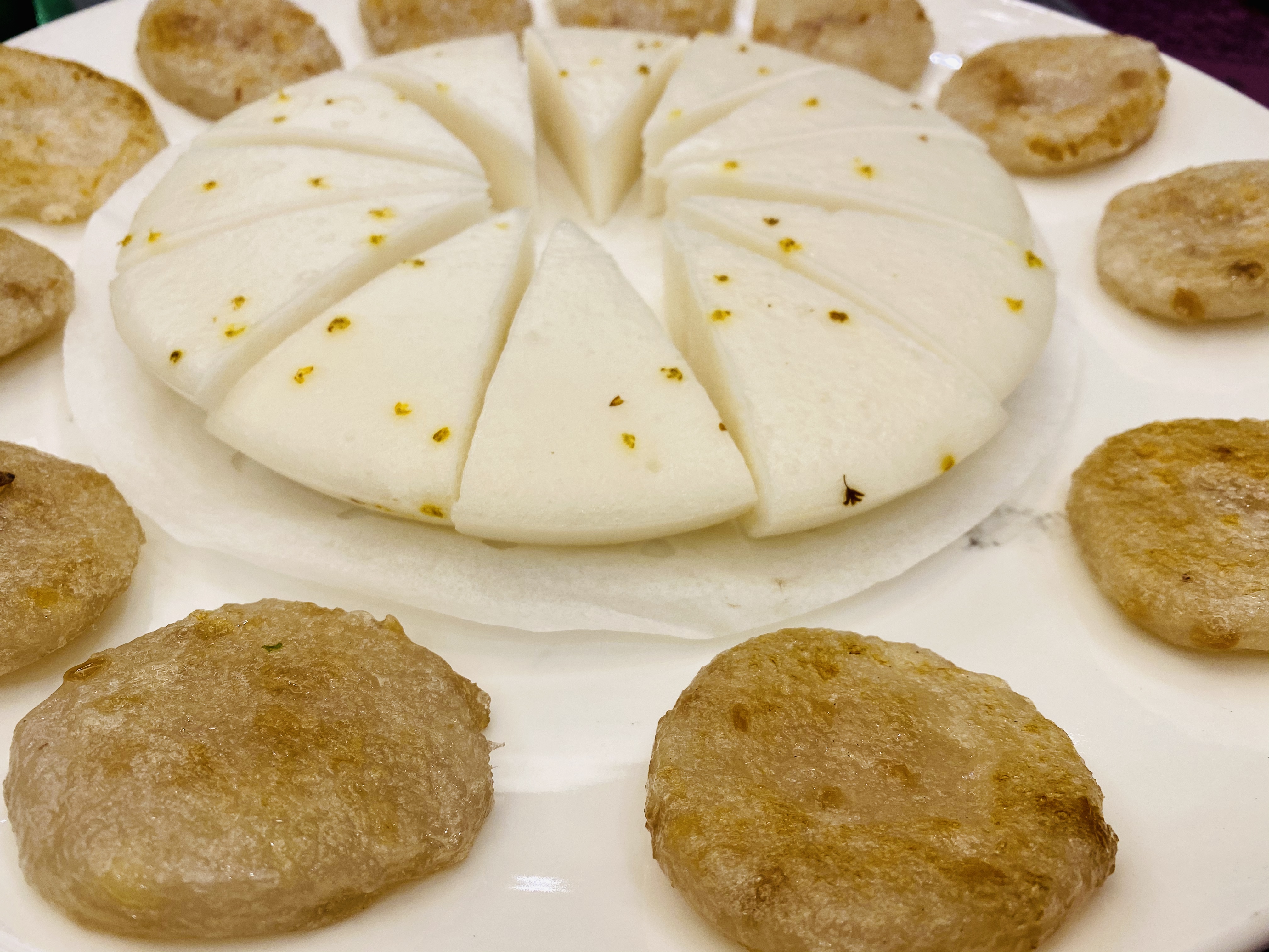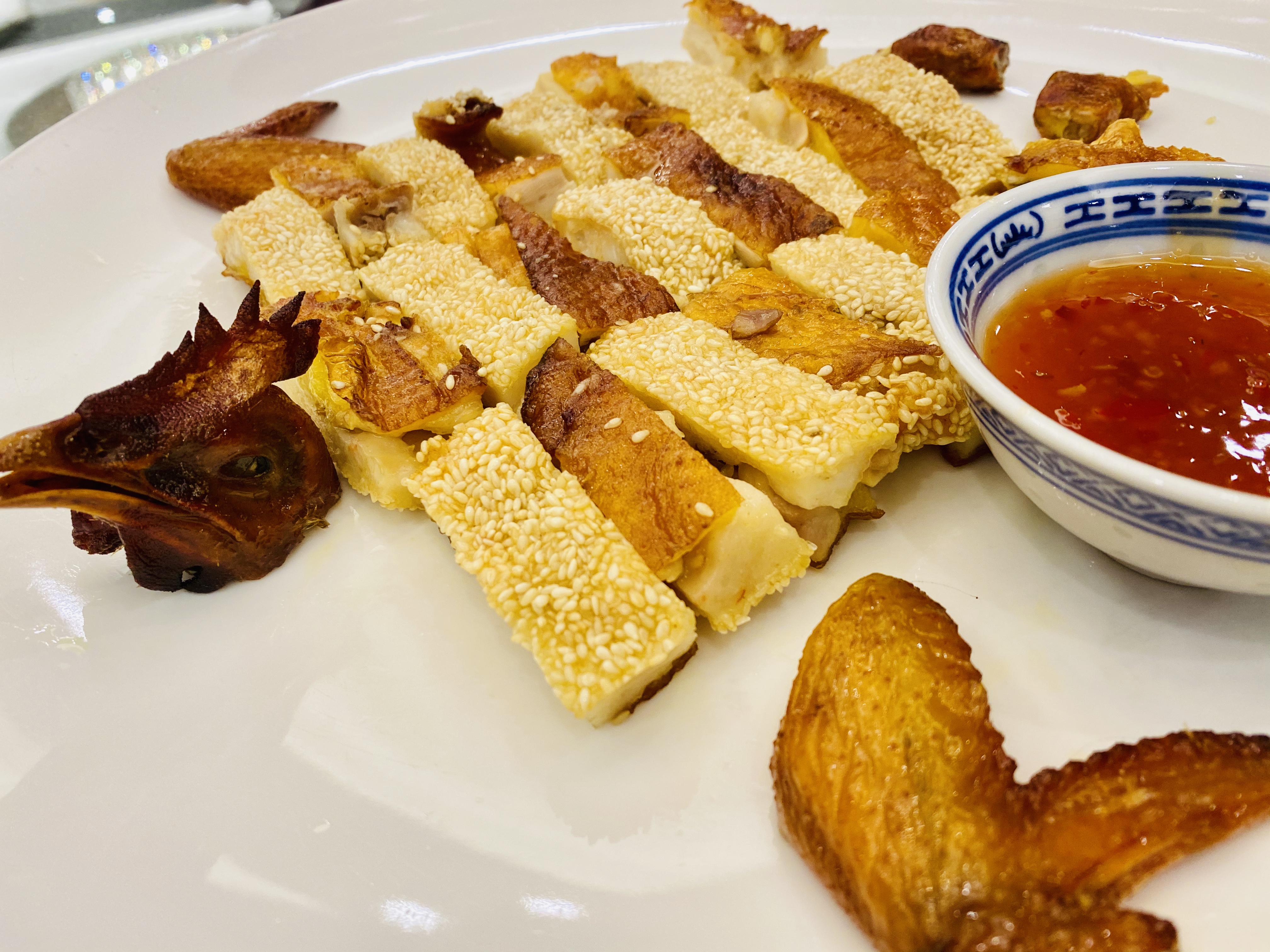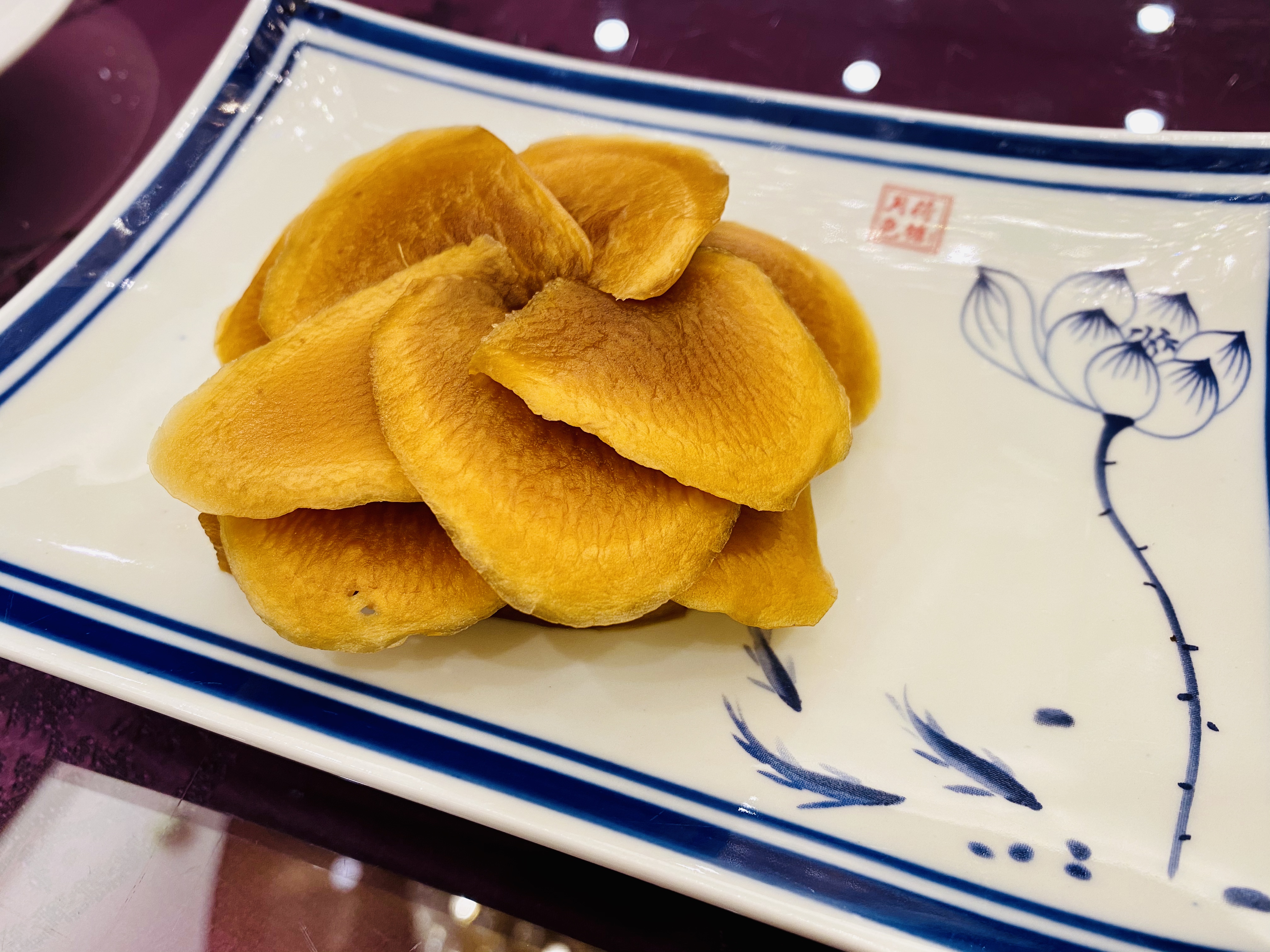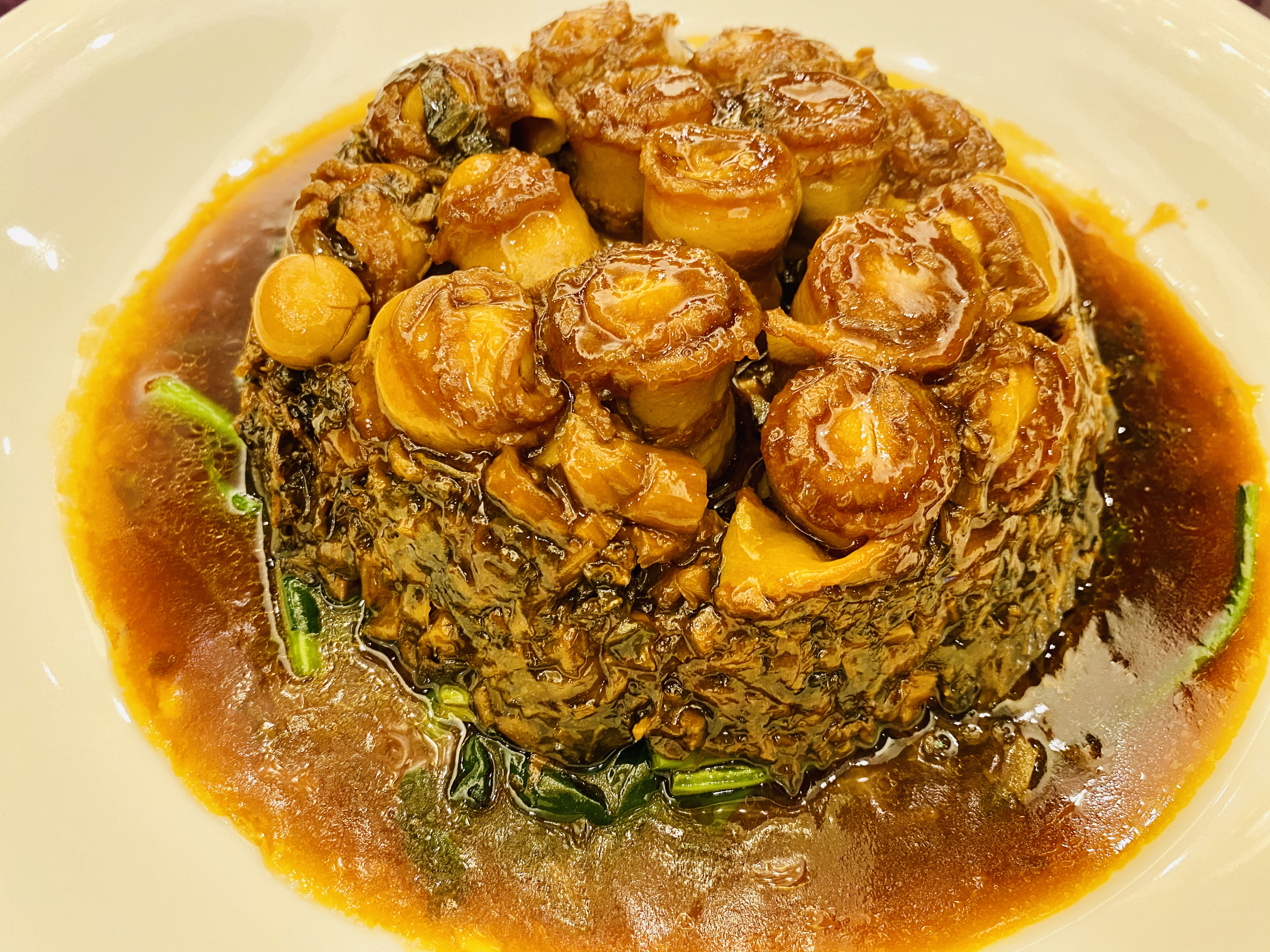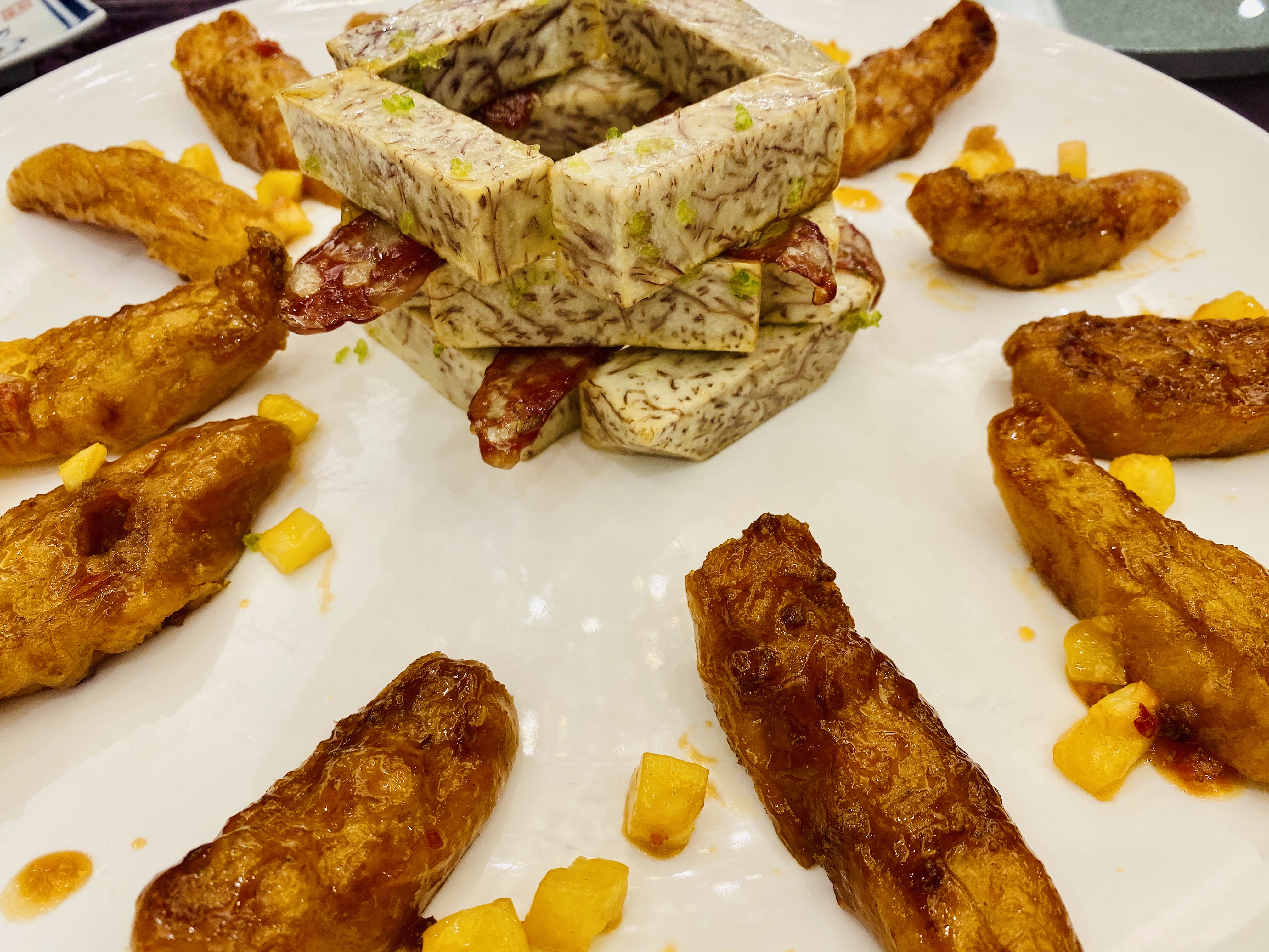 무로 만든 짠지, 혹은 피클 스러운 전채입니다. 새콤하고 뽀독뽀독 씹히는 식감이 애피타이저 역할을 잘 하네요. 역시 새콤하게 저미어진 오이입니다. 이녀석도 상콤하면서도 신선하네요. 타로를 튀겨서 마치 한국의 맛탕 비슷하게 달달한 소스로 볶아낸 전채입니다. 방울 토마토! 이 전채는 레시피가 궁금할 정도로 너무 신선하고 맛있었습니다. 어떻게 만들었을 지 계속 궁금하던.... 우엉이었을까요? 여튼 우엉스러운 녀석을 달달 짭조름하게 볶아내었는데, 역시 나쁘지 않습니다. 한국이었다면 흰 밥이랑 먹어도 괜찮을 반찬같은 음식이네요. 일종의 바베큐 플래터네요. 크리스피 포크, 차슈, 오리, 거위 등등의 바베큐들이 담겨있습니다. 여기서 저는 차슈 → 크리스피포크 → 오리바베큐... 순서로 좋아하지유.건부레가 들어간 광동식 탕입니다. 담백합니다. 건부레에는 그 뭐시냐... 피부에 좋다는 콜라겐이 많이 들었다고 하던데, 중식당 가시면 많이 드시길 바랍니다. 좋은 건부레는 많이 비쌉니다.... T.T고기와 마치 한국의 무말랭이 같은 야채를 자잘자잘 썰어 볶은 속을 중식 빵 속에 넣어 먹는 음식입니다. 빵은 부드럽고, 저 볶아진 속은 짭조름하면서 담백합니다. 야채에도 양념이 있어서 식감과 맛을 배가합니다. 무슨 생선이었는지 기억은 안나네요. 생선박사님 계시면 나중에 이거 보고 알려주시면 감사하겠습니다. 살이 부드럽고 마치 연하게 조리한 조기살이랑 비슷합니다. 쵸이삼이라고 하는 광동 지역의 국민 채소 입니다. 구기자와 치킨파우더를 넣어 익힌 듯 하네요. 보통 광동에선느 굴소스를 뿌려 먹습니다. 파와 생강을 거의 주재료만큼 많이 써서, 파와 생강의 향을 고기에 강하게 베이게 하는 음식입니다. 고기가 뭐였는지는 정확히 기억안나는 데, 건해삼과 같이 볶아내었네요. 중식에서는 해삼도 건해삼을 사용합니다. 역시 해삼의 향과 식감이 달라지죠. 가운데는 타로와 중식 햄이고, 주변에 두른 것은 호박이려나요? 호박 좋아요. 맛있습니다. 호박 아니었나.... 급 헛갈리기 시작하네요. 파인애플과 함께 조리한 거 보면 고기일 수도 있겠다 하는 생각이... 급 드네요. 통닭고기 요리 입니다. (음? 독수리 오형제 비행선인가...)자세히 보시면 알겠지만, 껍질 부분은 기름기를 쫙 빼면서 바삭하게 조리를 하였고... 안쪽 살 부분은 깨를 밀도있게 붙였습니다. 그리고 나서 플레이팅 할 때는 번갈아가면서 뒤집어 놓아 이런 모습이 되었습니다. 셰프의 노고가 돋보이는 요리네요. 굴 튀김입니다. 같이 남방쌀을 튀겨낸거 같은데, 입안에서 씹는 식감의 재미를 주네요. 베이커 안에 관자살을 넣은 요리일까나요?..... 맛있었던 기억은 있는 데.... 흠.... 아래 쪽에는 야채를 깔아서, 함께 먹을 수 있게 한 요리. 조갯살, 어묵 등을 넣은 볶음밥입니다. 이것도 독특하고 나쁘지 않았네요. 첫번째 디저트입니다. 마치 한국의 술빵과 개떡 같은 생김세입니다. 둘 다 달달한 맛입니다. 참고로 1인당 하나씩 먹은 겁니다. 원탁에 가득 사람들이 앉아있기 때문에... 개수가 많네요. 마치 한국의 팥죽 비슷한 디저트입니다. 하지만 한국처럼 걸쭉하지는 않습니다. 탕정도의 농도. 하얀 것은 땅콩/깨속이 들어간 달달한 찹쌀떡 같은 것이라고 생각하면 됩니다. 중국어로는 탕위엔(광동어로는 통윈)이라고 합니다. 입가심은 과일 디저트! 광동지역은 아열대지역이라 과일이 풍부한 곳이죠.