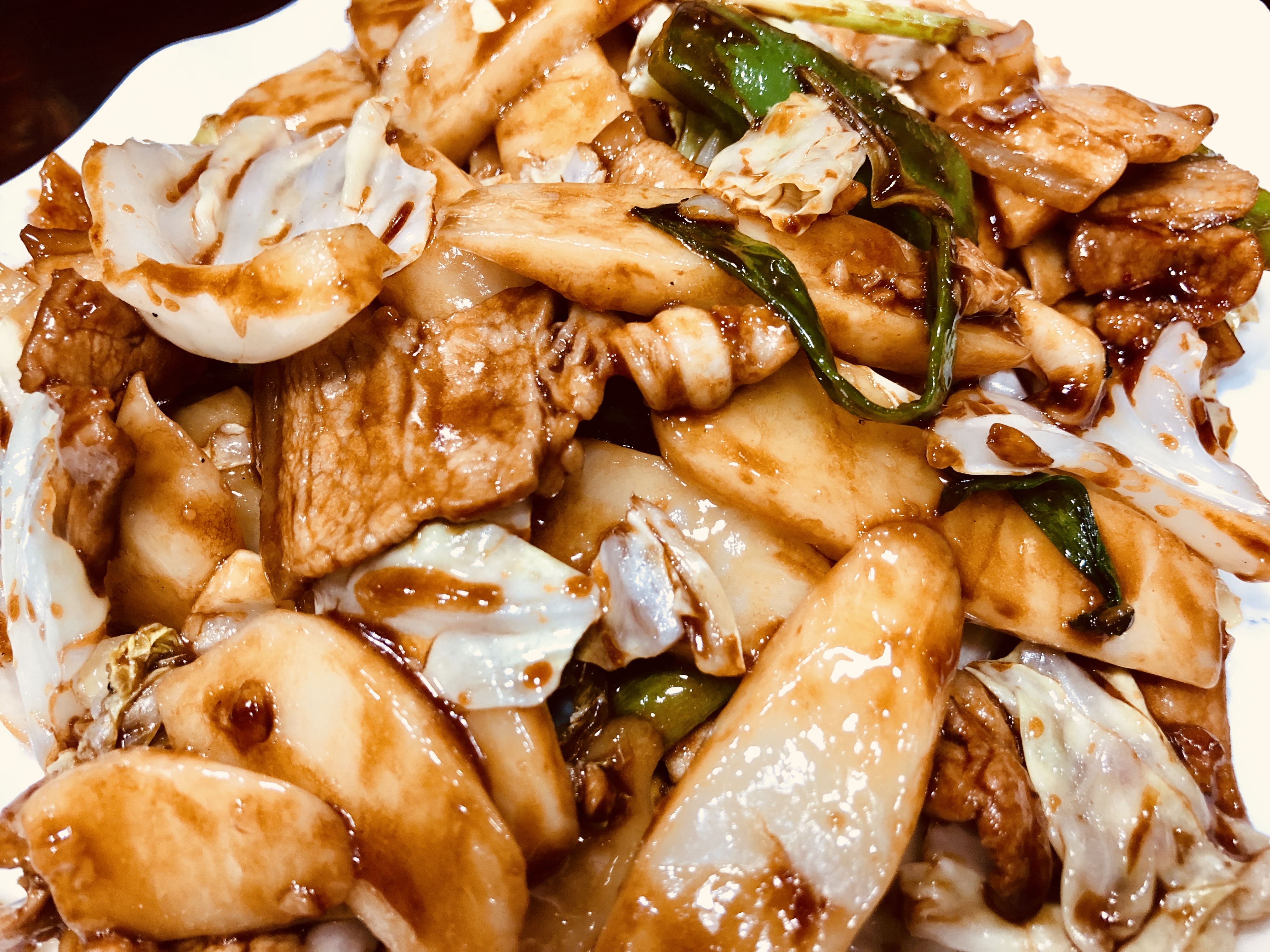 면장(일종의 콩으로 만든 중식 장, 춘장과 비슷하지만 색이 진하지 않음) 혹은 황두장 등을 활용해서 삼겹살 고기, 야채, 떡 등을 볶은 음식입니다. 메뉴 이름 뭐였는지 가물가물하네요. (설마 회과육은 아니었겠지.. 설마... )
